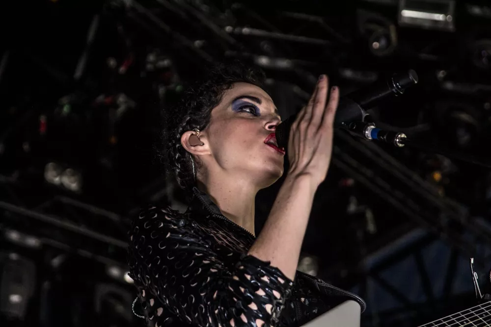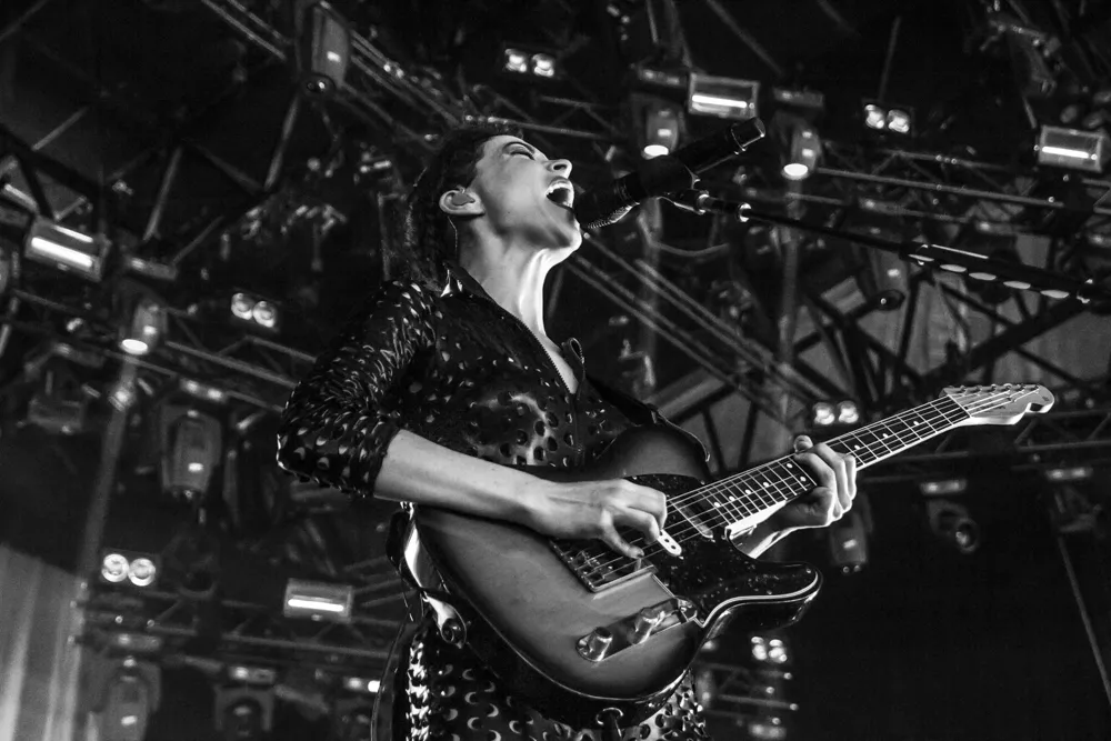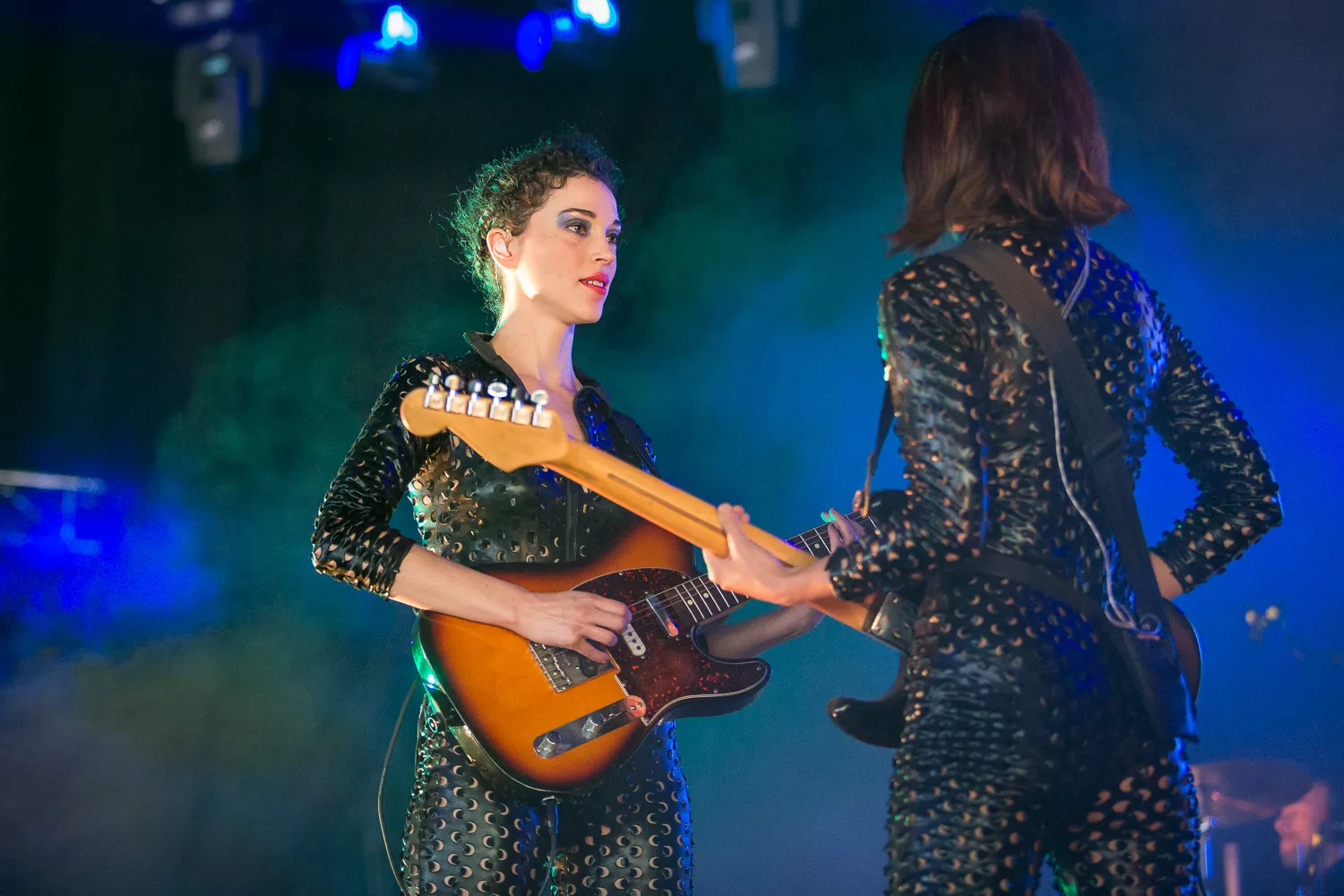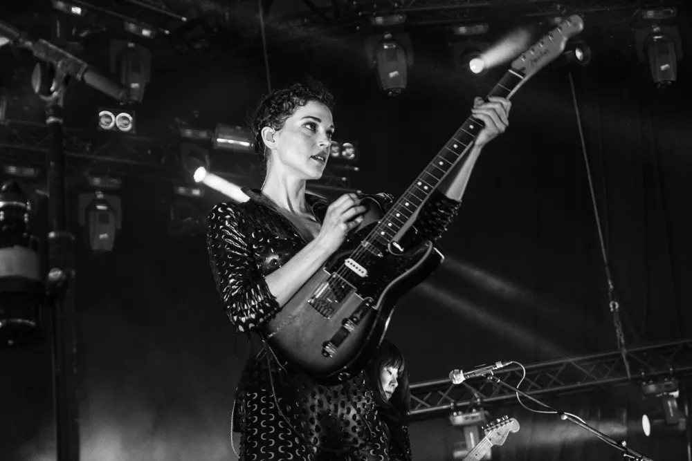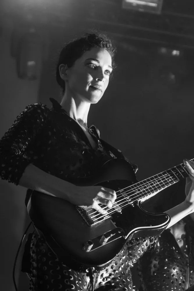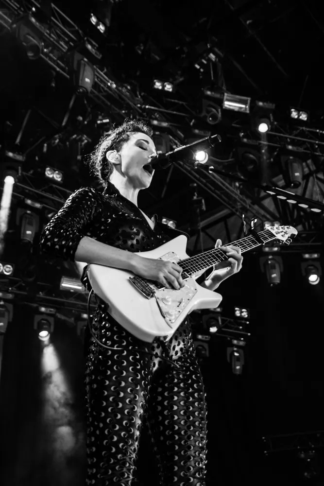 Det hele åpner med en datamaskin-stemme som byr oss alle velkomne. Publikum jubler. St. Vincent aka Annie Clark og medgitarist kommer stivt ut på scenen, og har på seg like antrekk - tettsittende skinndrakter med huller i. Med høye hæler og uten å se på hverandre, skritter de koordinert frem mot publikum.