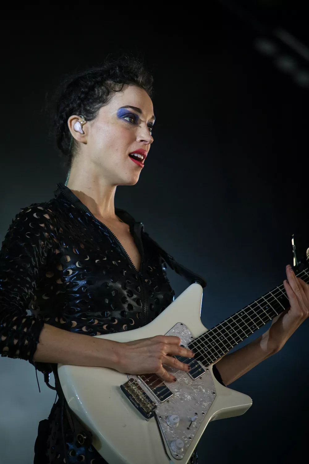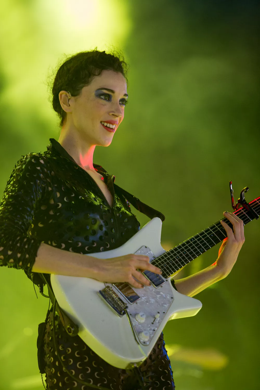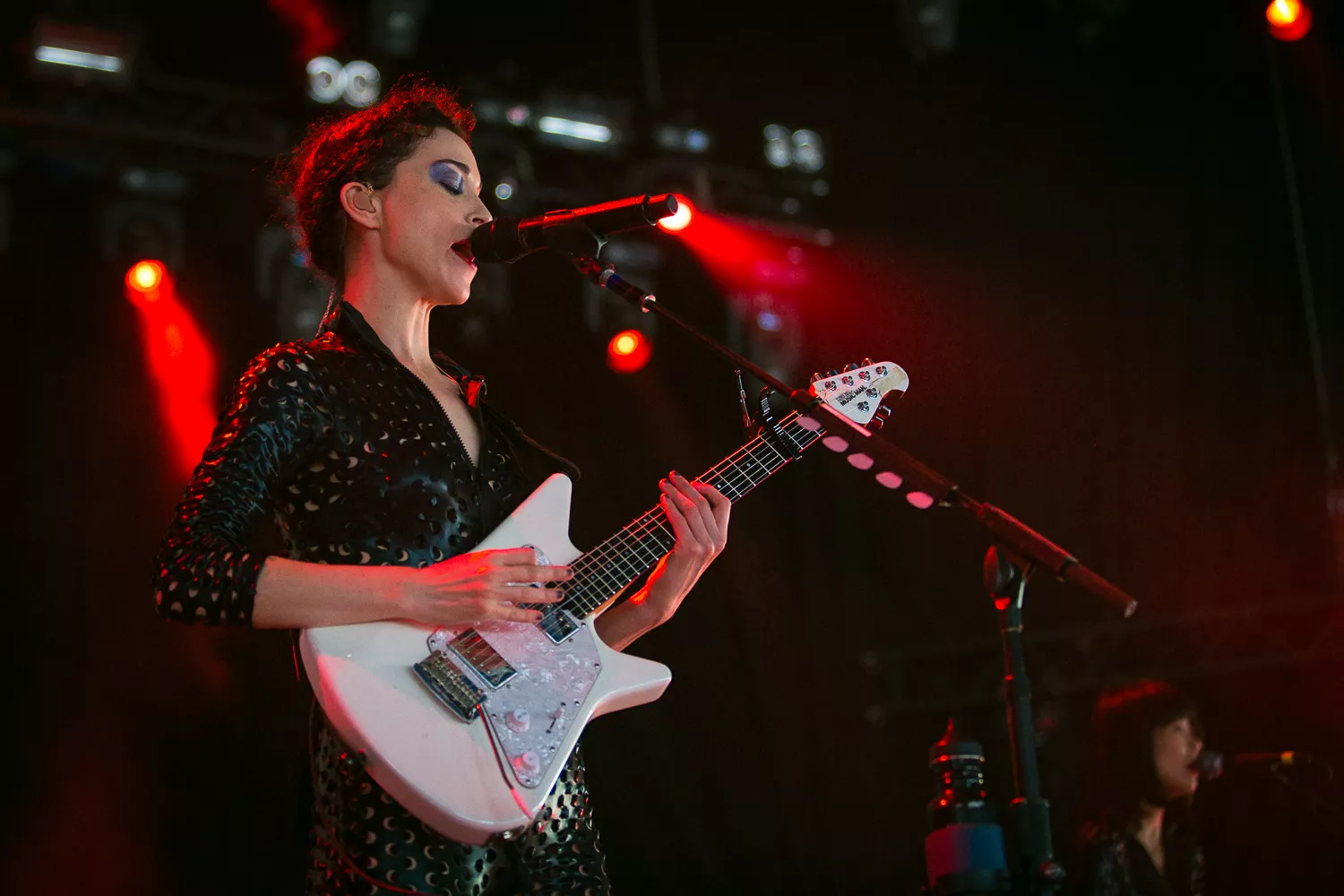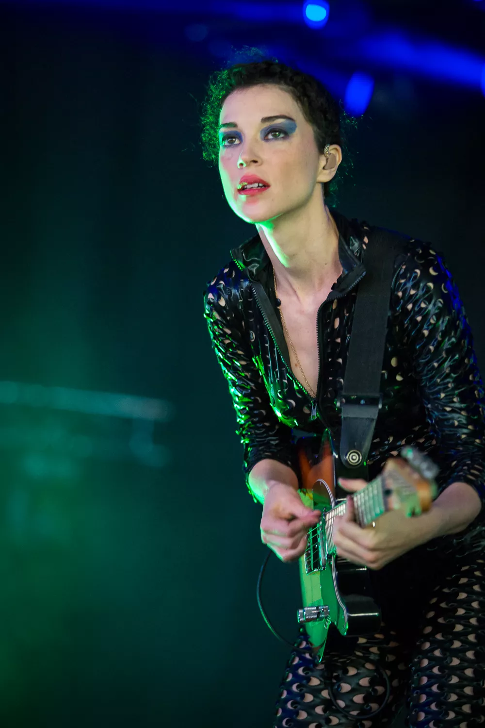 Det hele åpner med en datamaskin-stemme som byr oss alle velkomne. Publikum jubler. St. Vincent aka Annie Clark og medgitarist kommer stivt ut på scenen, og har på seg like antrekk - tettsittende skinndrakter med huller i. Med høye hæler og uten å se på hverandre, skritter de koordinert frem mot publikum.