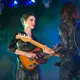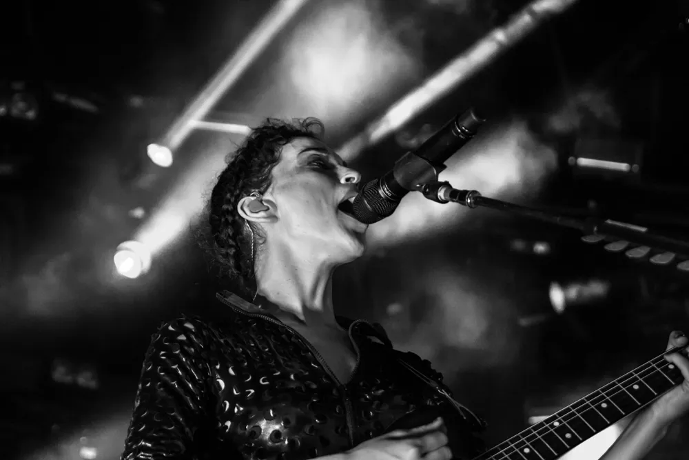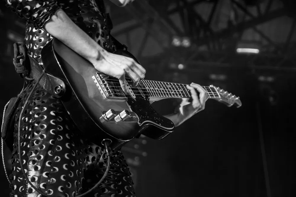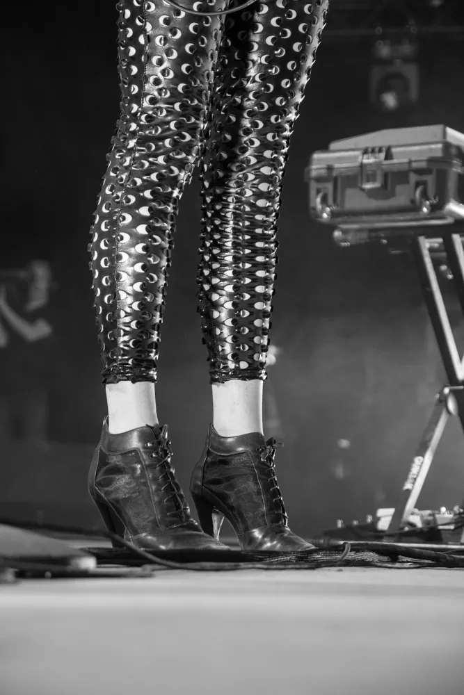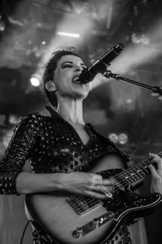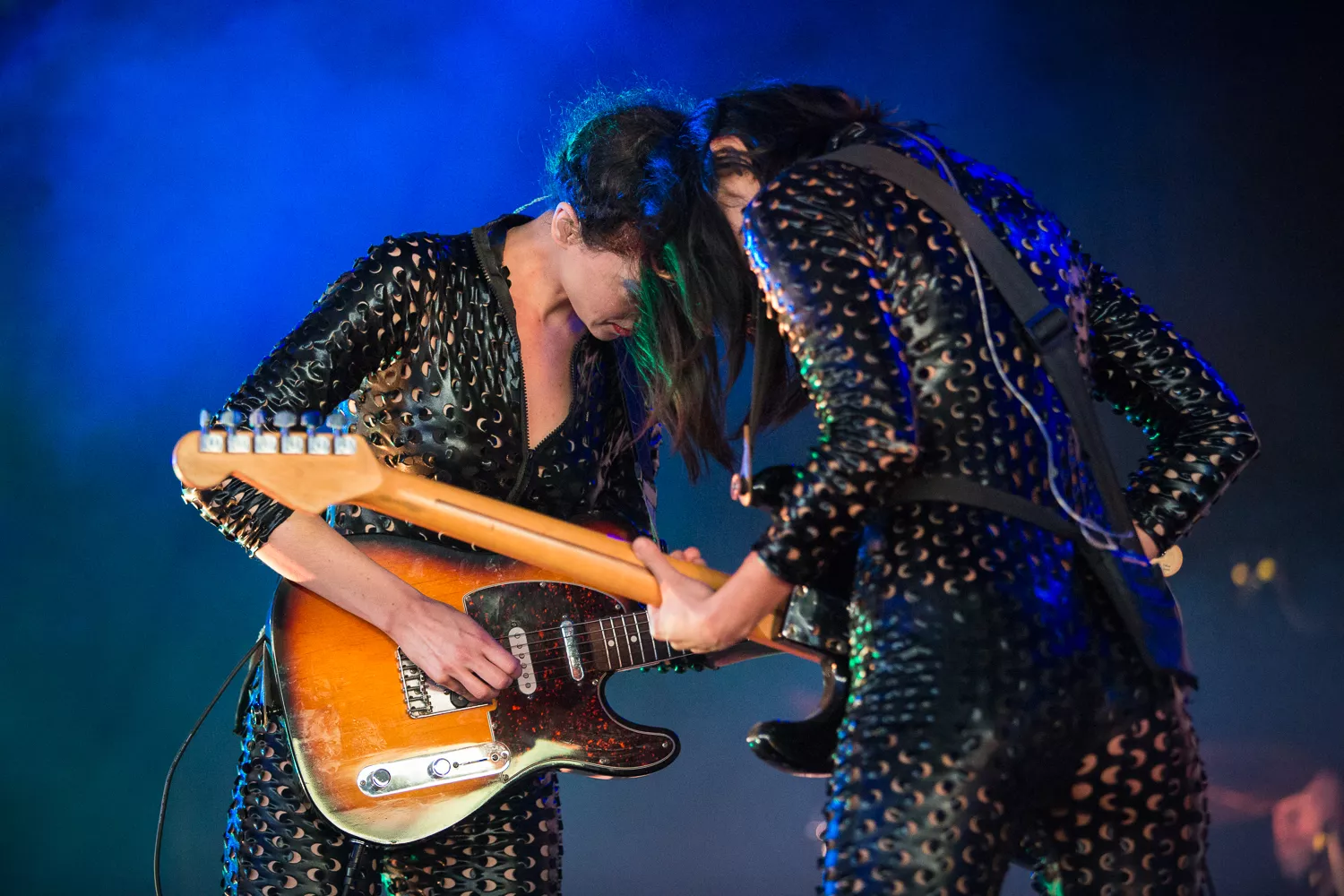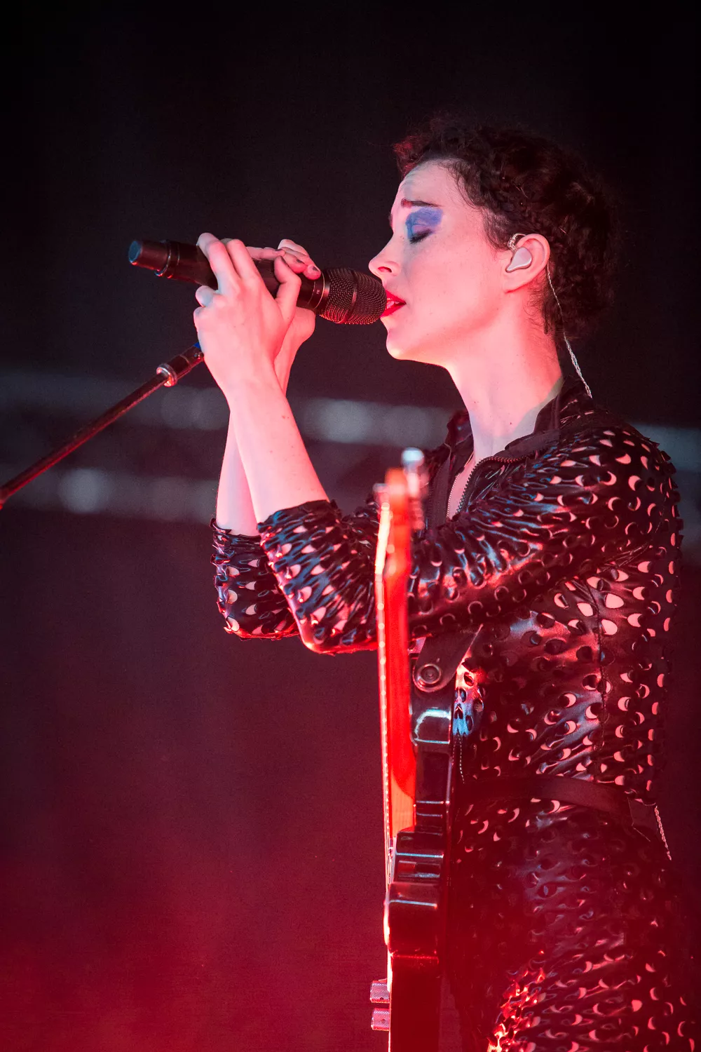Det hele åpner med en datamaskin-stemme som byr oss alle velkomne. Publikum jubler. St. Vincent aka Annie Clark og medgitarist kommer stivt ut på scenen, og har på seg like antrekk - tettsittende skinndrakter med huller i. Med høye hæler og uten å se på hverandre, skritter de koordinert frem mot publikum.