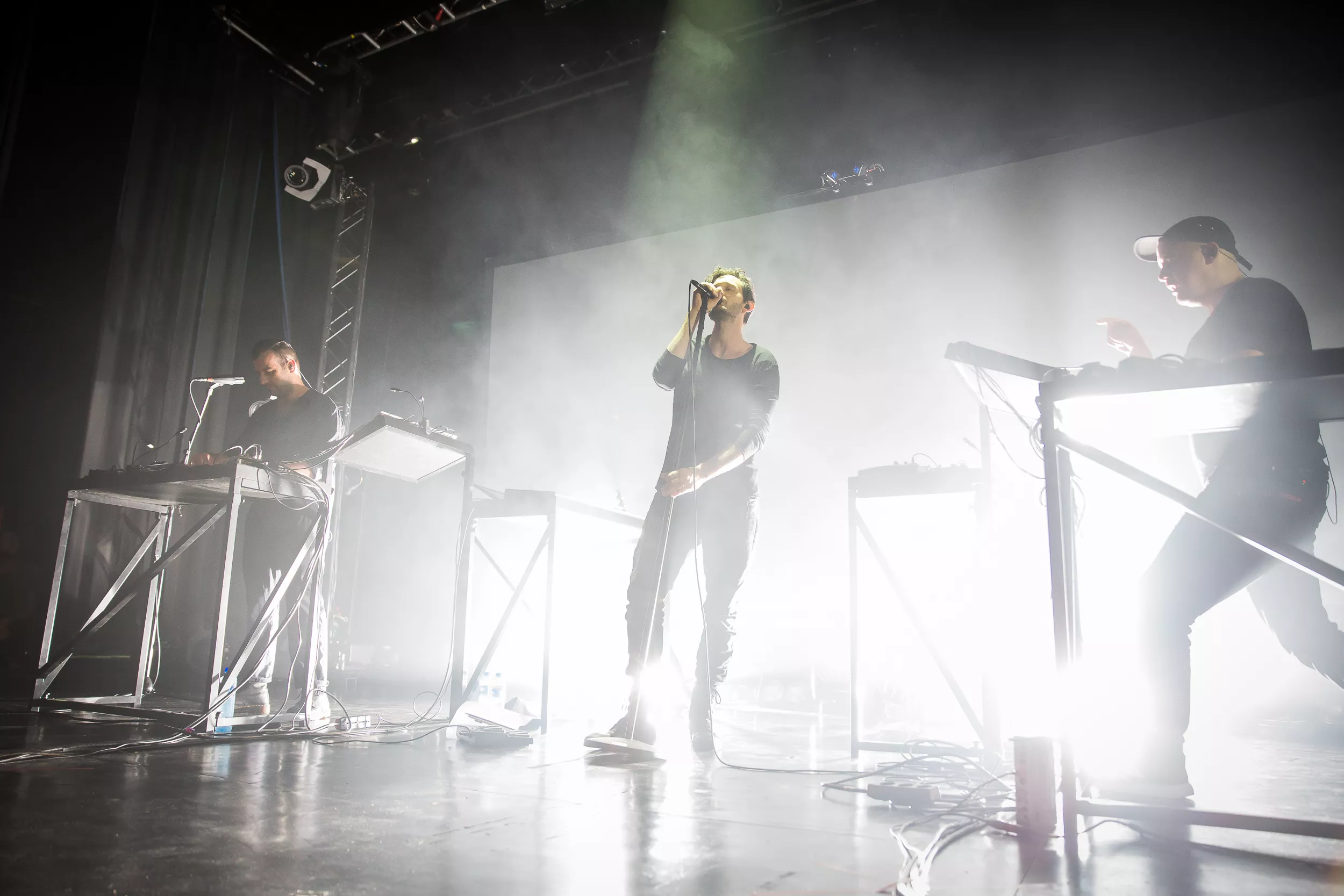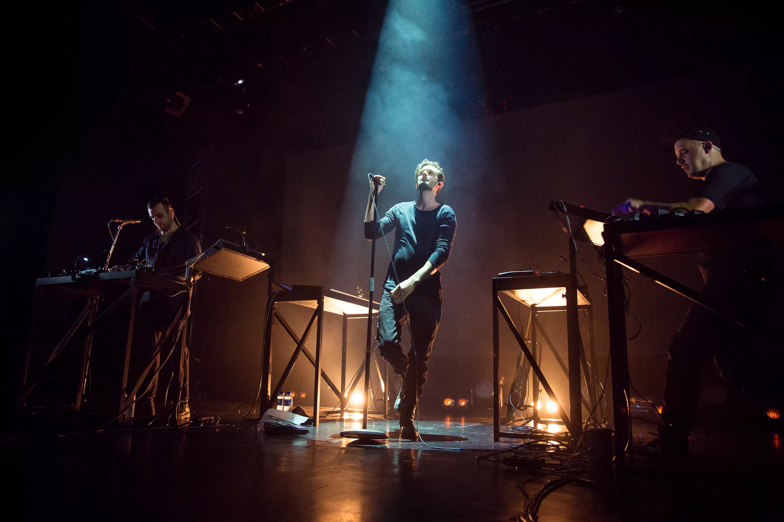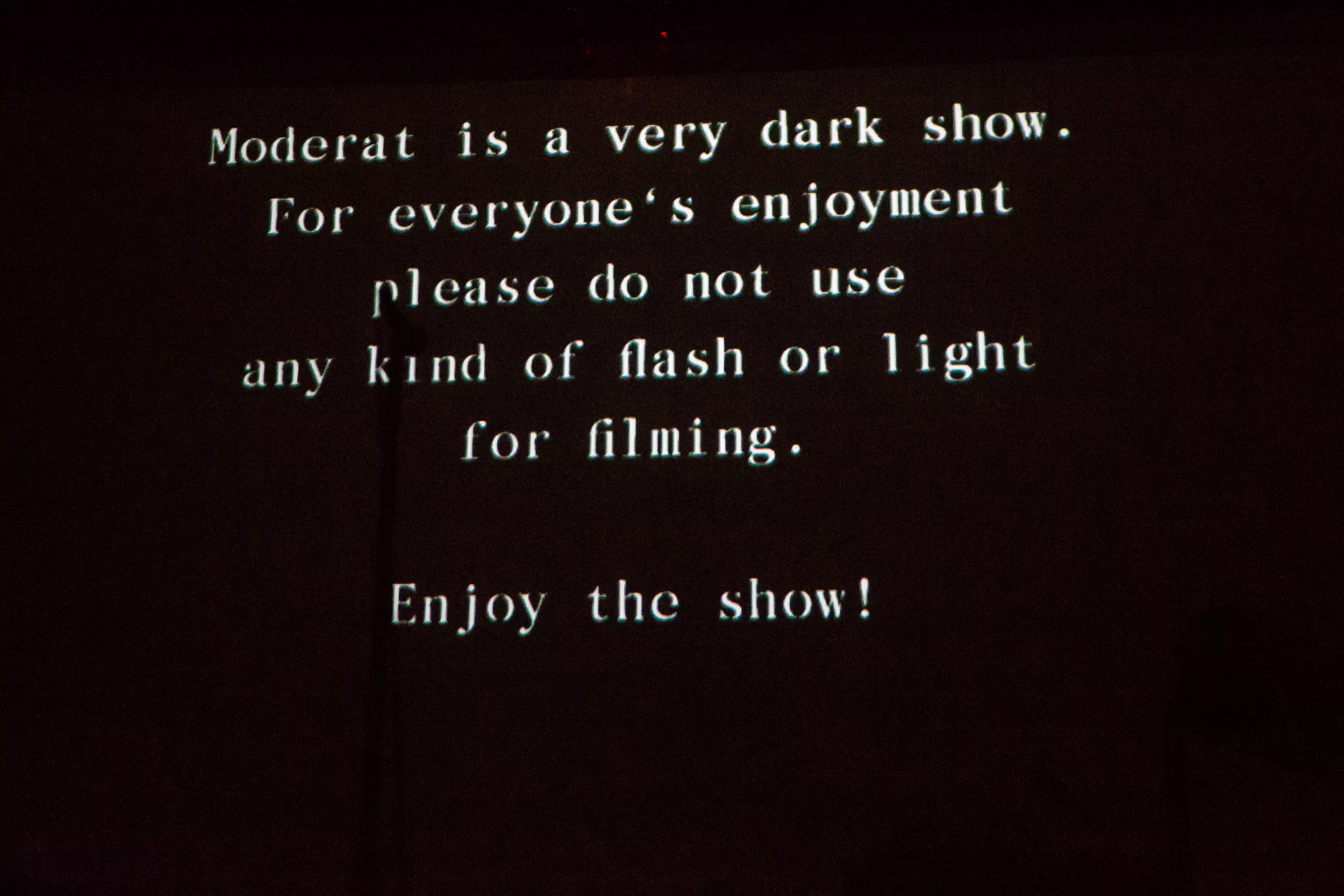 Sentrum Scene er smekkfullt av festglade mennesker når de berlinske elektronika-heltene inntar det mørklagte konsertlokalet. ’’Moderat is a very dark show. For everyone’s enjoyment please do not use any kind of flash or light for filming. Enjoy the show!’’