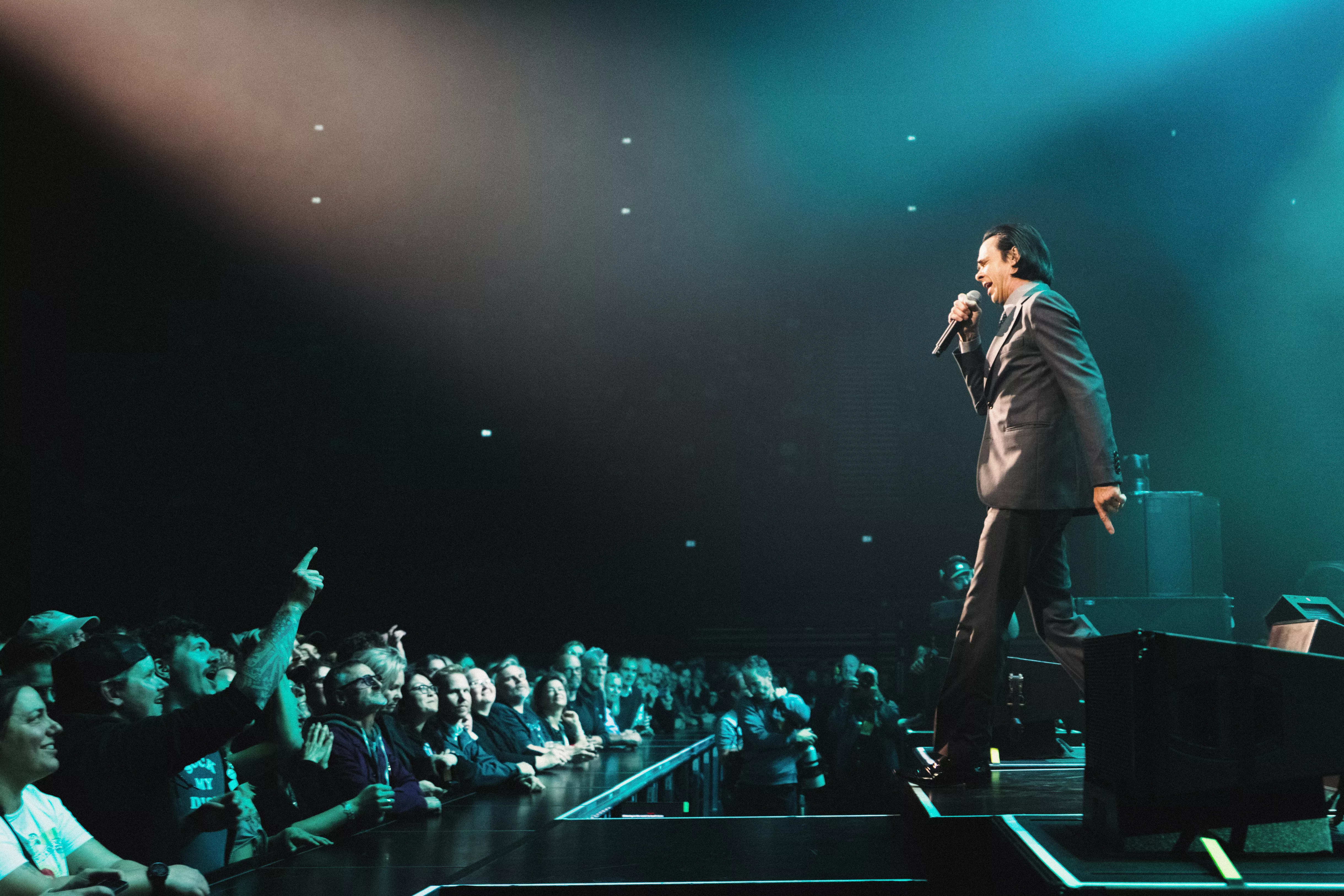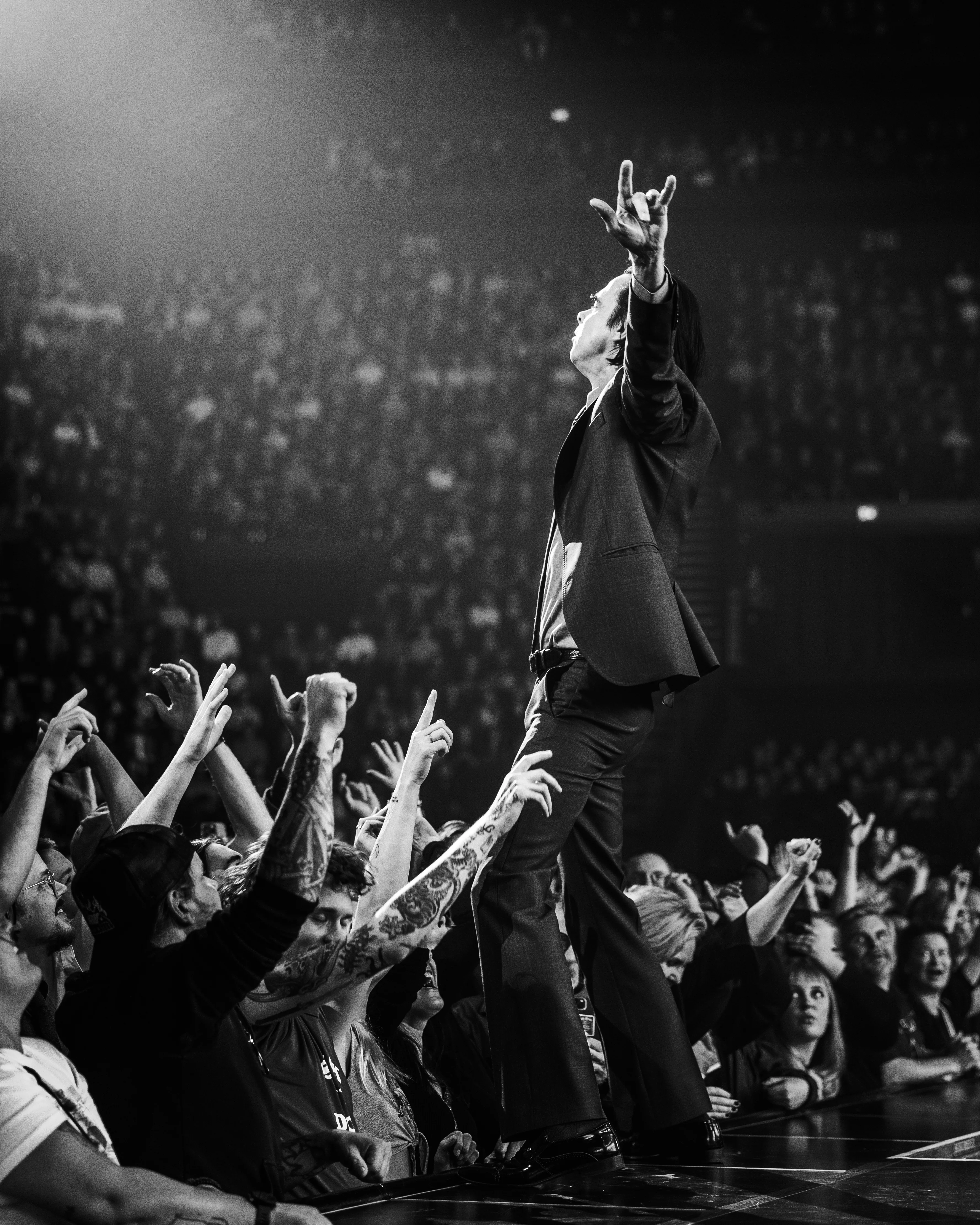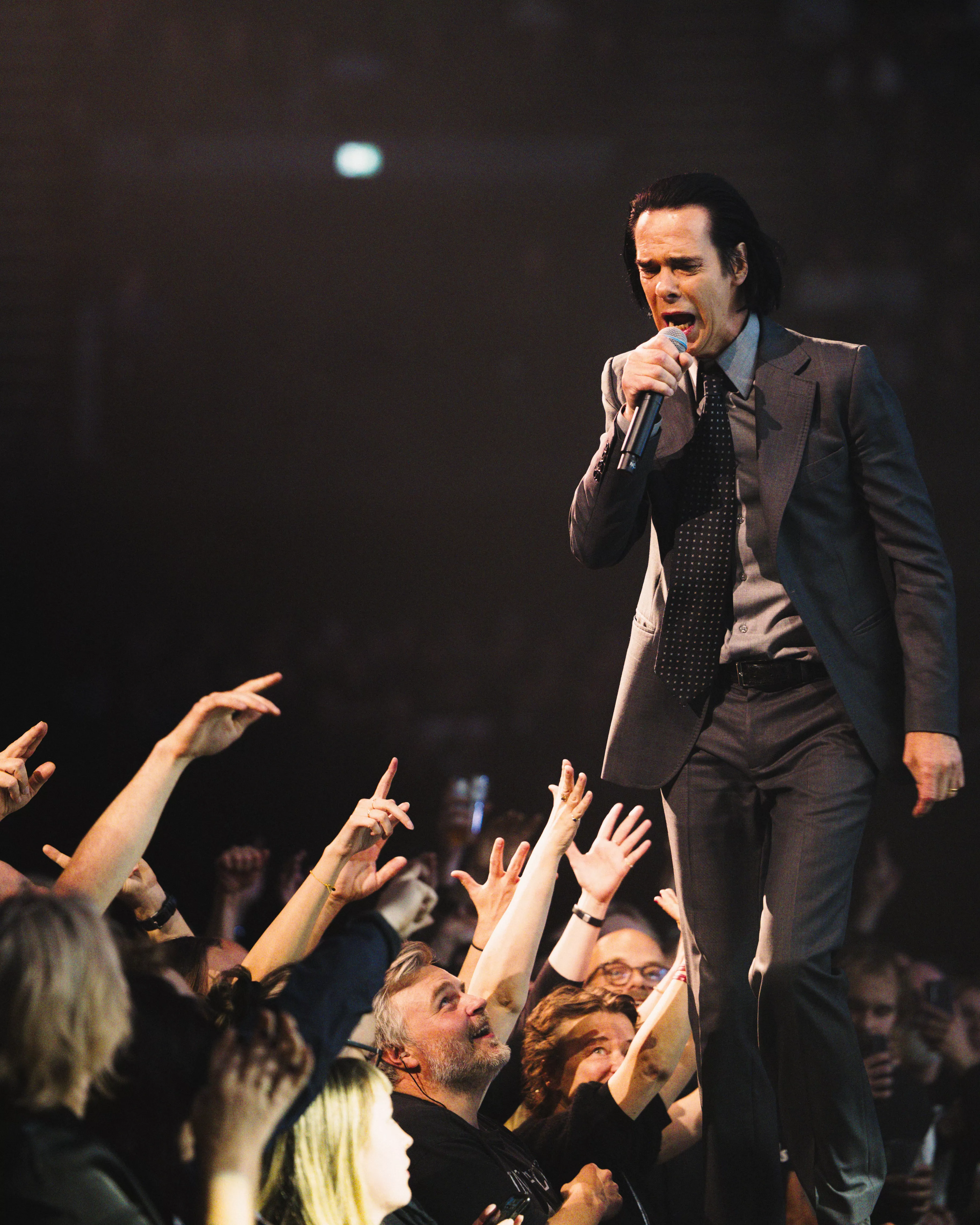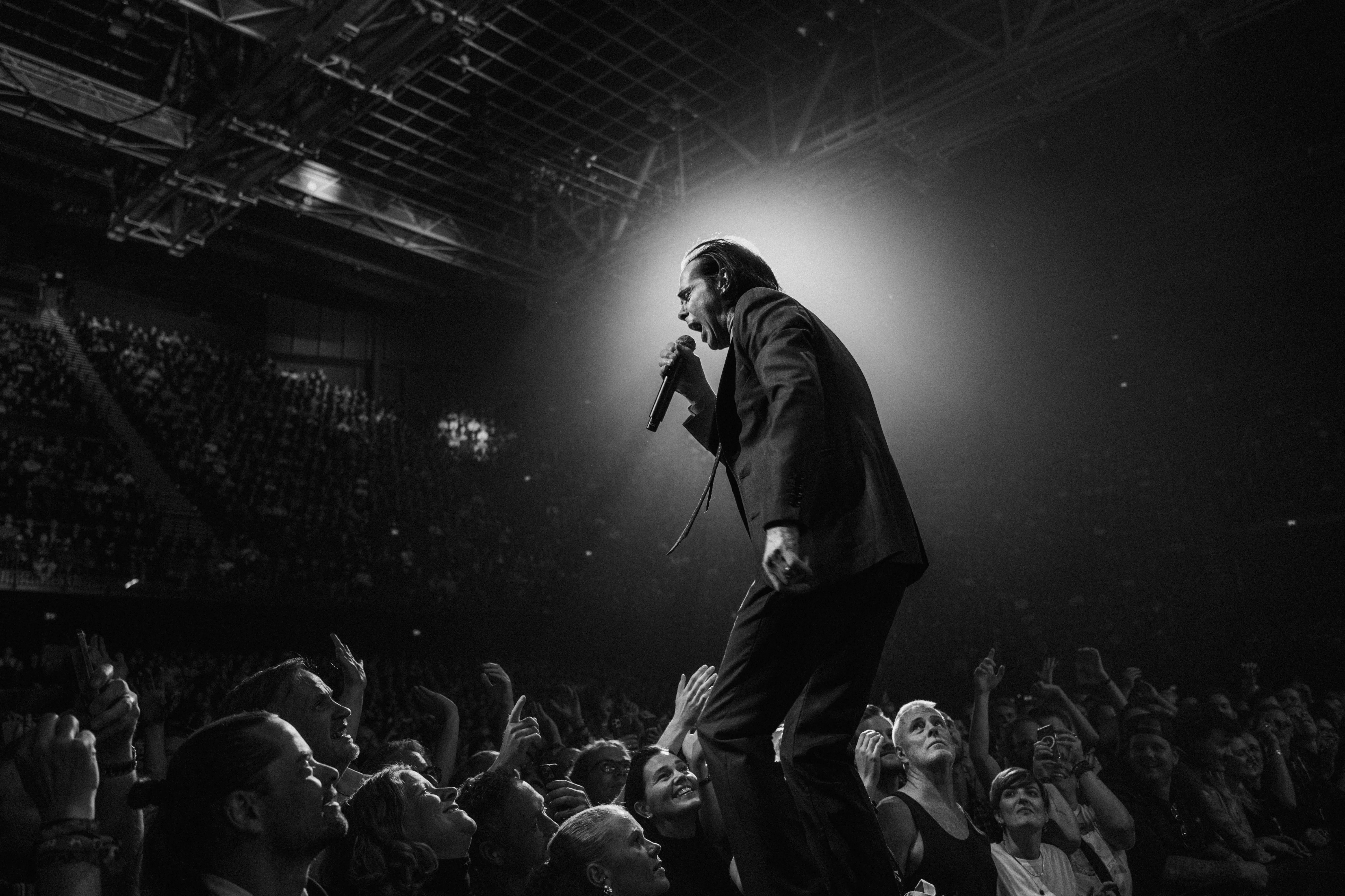 Oslo Spektrum var tettpakket når Nick Cave og The Bad Seeds gikk på scenen. Fra tribunene kunne jeg se et hav av måner og skinnjakker, krydret med et par yngre tilsvarende alternative typer (også med skinnjakker).