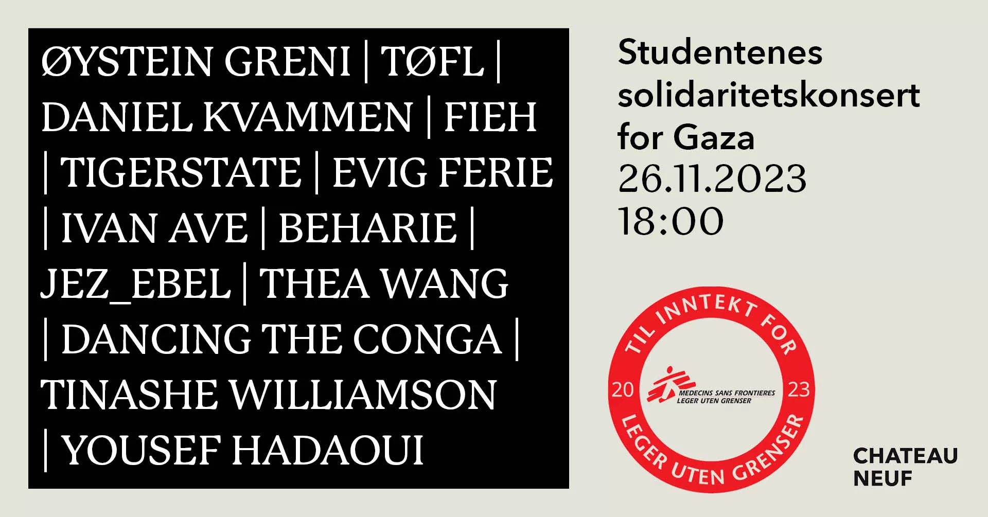 Tinashe Williamson og Yousef Hadaoui er konferansierer når Det norske studentersamfundet i Oslo arrangerer solidaritetskonsert for Gaza. Søndag 26. november står Fieh, Beharie, TØFL, Øystein Greni (kjent fra Bigbang), Evig Ferie, Ivan Ave, Beharie, Jez_ebel, thea wang og Dancing the conga på scenen hos Chateau Neuf. Nå slippes siste tilskudd til programmet, Daniel Kvammen.