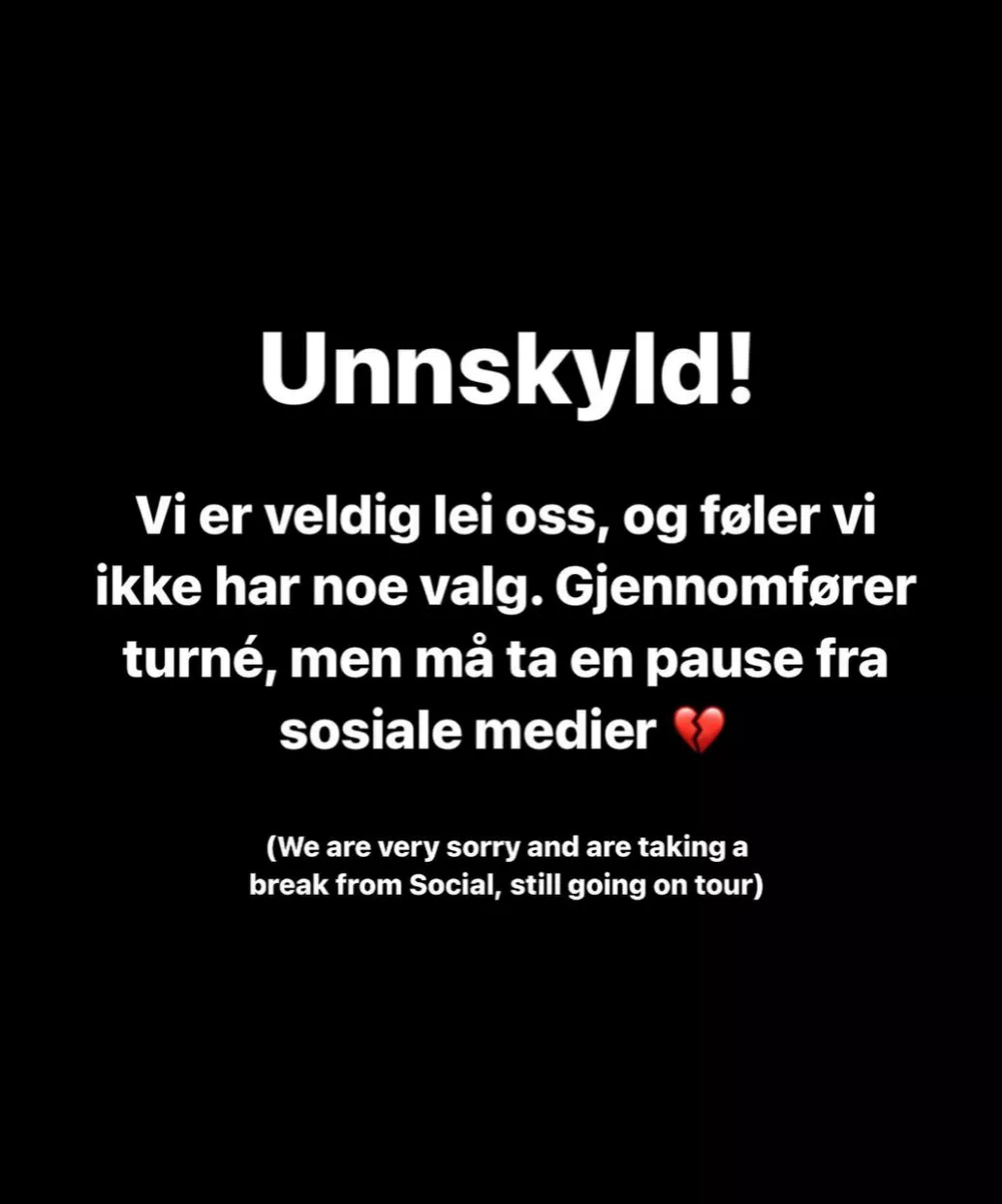 «Unnskyld. Vi er veldig lei oss og føler vi ikke har noe valg. Gjennomfører turné, men tar en pause fra sosiale medier».
