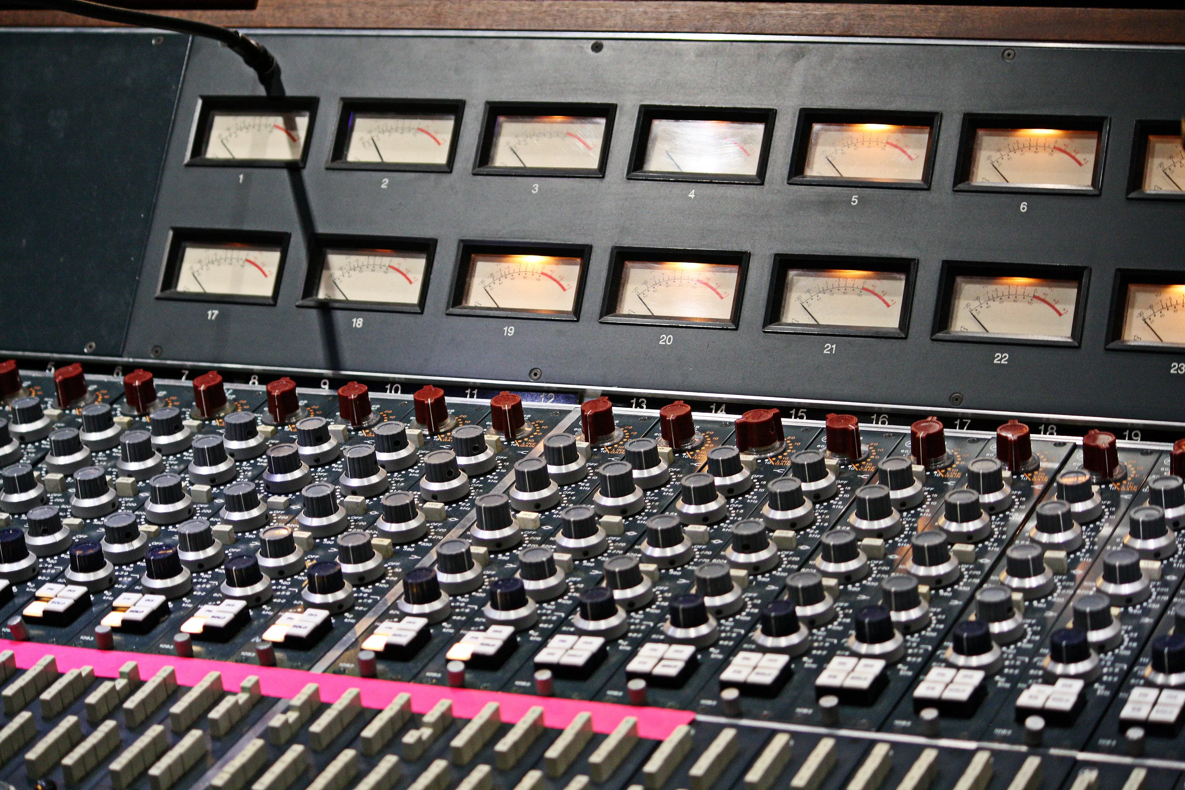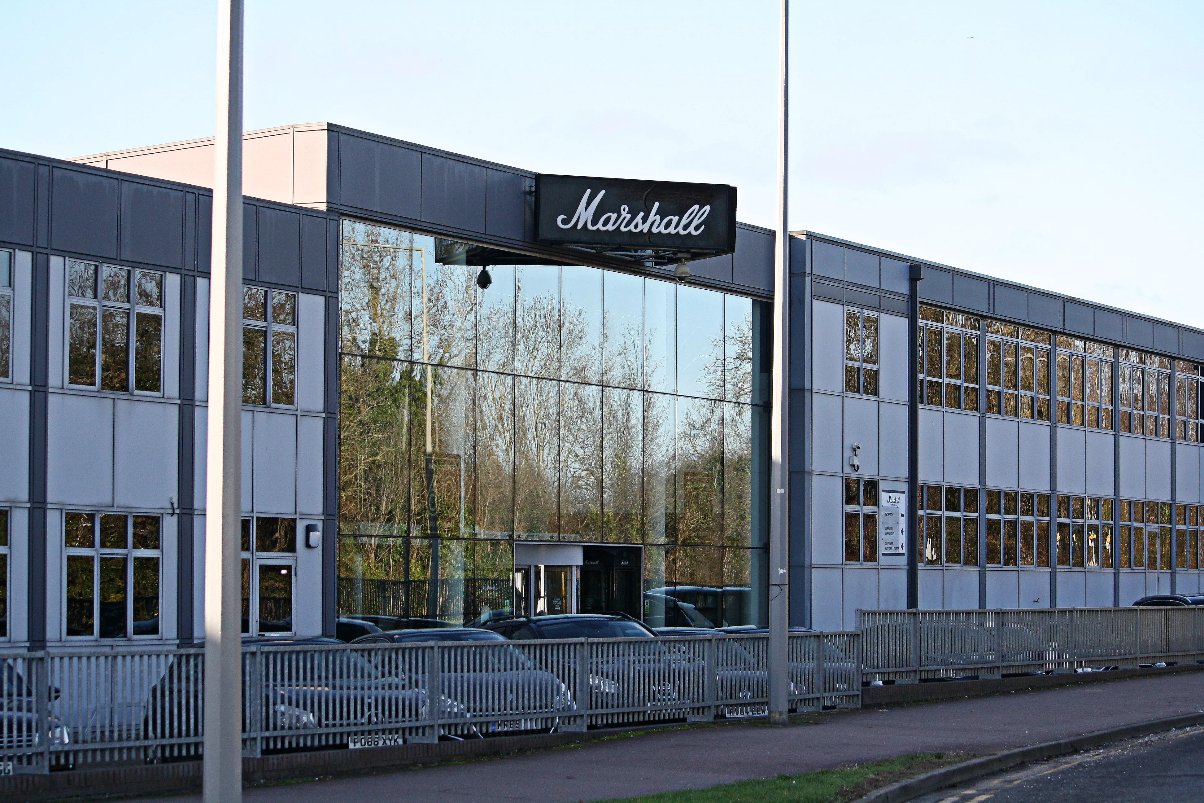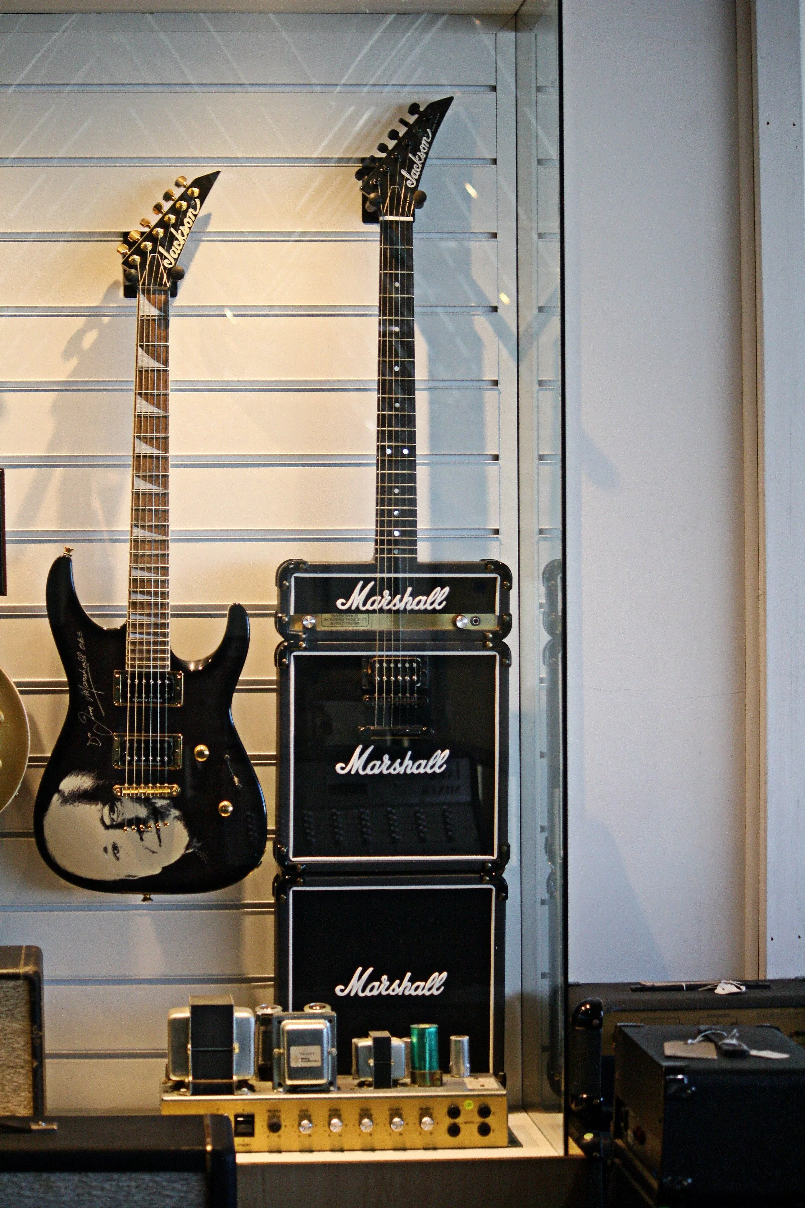 Bygningen er avlang og svart. Med noe fantasi kan den sammenlignes med en avlang Marshall-forsterker fra 70-tallet, og den bærer 196 ansatte og så mange komponenter og historie at det er nok og det er over. Marshall-komplekset i byen Milton Keynes, omtrent 80 kilometer nord for London, ble bygget i 1967 og rommer i tillegg til et større fabrikklokale og atelier et museum. Det er her guiden og Marshall-arbeideren gjennom 39 år, Steve Hill, begynner turen vår. Han beiter på dings etter dings.